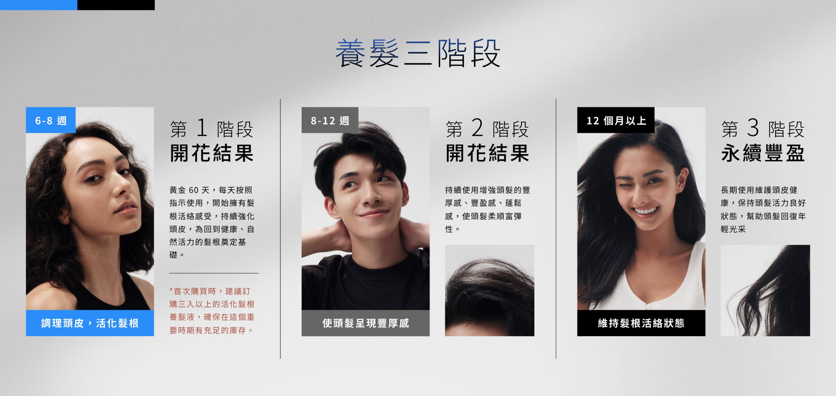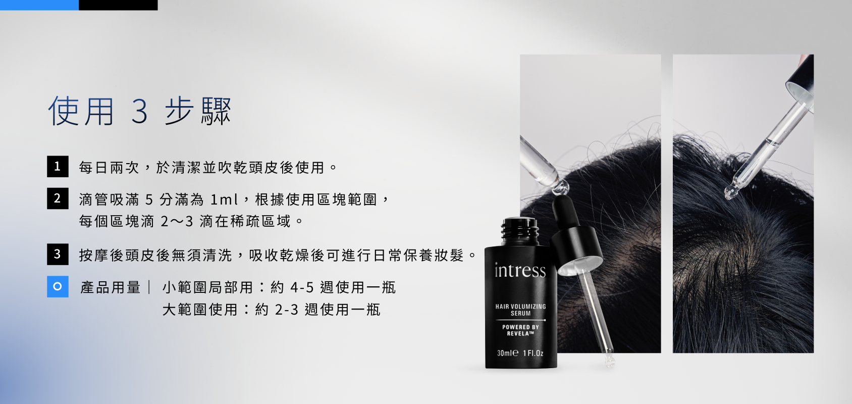 1. 養髮液使用建議:根據使用區塊大小,每次用量僅需1ml,小範圍塗抹3-4週使用一瓶,大範圍塗抹2~3週使用一瓶。