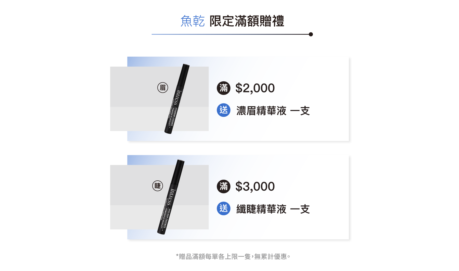 (3) 贈品按成功結帳順序發送,僅限官網會員領取,將於購物車內顯示獲取贈品,若已經兌換完畢將不會於購物車中顯示 (數量有限,送完為止) 。